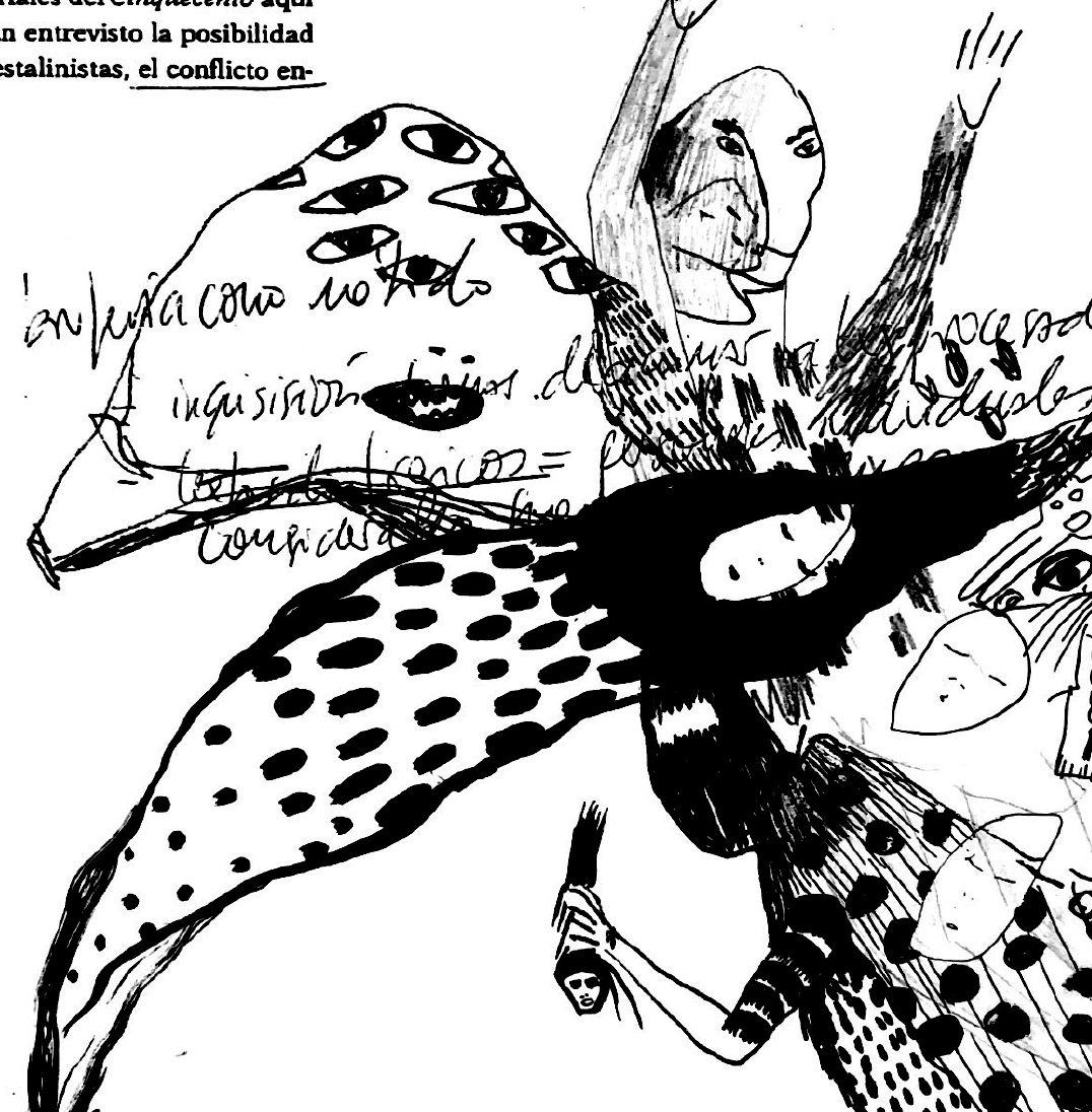 imprimo el texto lo pego en mi pared y le bailo, lo embrujo, le practico el animismo que ginzburg me dijo sin decir y yo mal leí por mala lectora. bailamos toda la noche y sobrevuelo sus letras todas. dibujo brujas, criaturas y ejércitos de almas. emergen fuegos que calientan y reactivan.